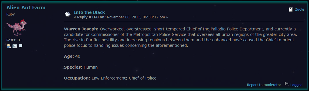 Belmont2500 already held the record for fewest posts of any author in the Darwin’s Soldiers canon, but he outdid himself when Hania Enapay never progressed beyond this bare-bones character sheet. Belmont’s phrasing makes it sound like there are other RPs the character has appeared in but I don’t actually care enough to go check.