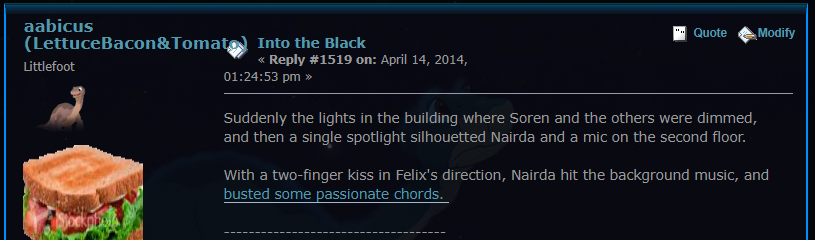 Not technically a character, but bestariana1girl nipped in once and posted a single emoji after learning she needed 50 posts to qualify for a forum member tag. nick22 quickly deleted it with his admin powers, but Winky will forever live on in Serris’ OOC.