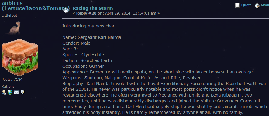But it’s not just one-hit-authors whose creations couldn’t quite reach the silver screen! Serris made Into the Black history by posting Dolly, a gene therapy pioneer who doesn’t survive her own character sheet. LettuceBacon&Tomato’s character Karl took a similar bullet for the plot in the Racing the Storm discussion section. At least they’re in good company.